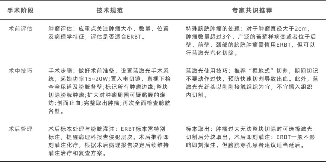 手术应当分步骤、规范系统性地完成:(1)麻醉;(2)摆放截石位,手术区域消毒、铺单;(3)置入操作镜,观察全尿道;(4)全膀胱镜检;(5)切除膀胱肿瘤,术后留置尿管;(6)详细描述术中所见及标本情况,送病检;(7)完成手术记录。假如术中发现无法行ERBT,可以根据实际情况改为蓝激光汽化切除术。