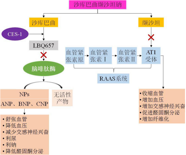 沙库巴曲是一种前体药物,进入体内后代谢成活性脑啡肽酶抑制剂,发挥排钠利尿、血管舒张作用,降低血压,还可以抑制心肌肥大、心肌纤维化、肾脏纤维化。