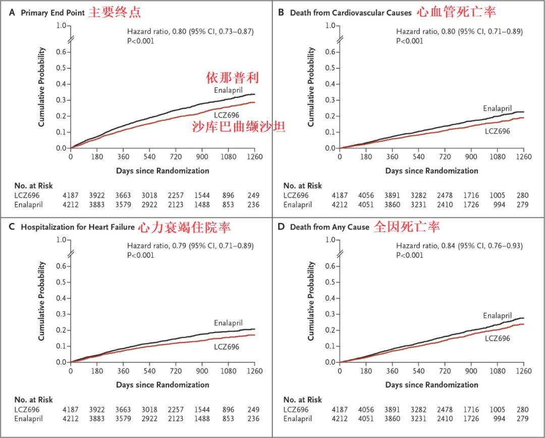 PARADIGM-HF试验显示,与ACEI药物依那普利相比,沙库巴曲缬沙坦钠使主要复合终点(心血管死亡和心衰住院)风险降低20%,心血管原因死亡风险降低20%,心力衰竭住院风险降低21%,全因死亡风险降低16%1。