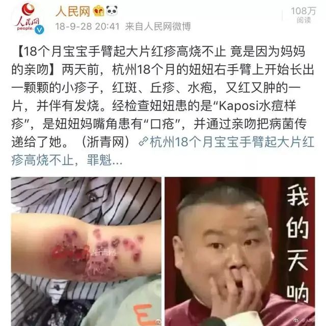 医生判断,Mariana很可能是通过亲吻感染到这种疱疹病毒的,但是测试后发现孩子的父母均没有感染。唯一的可能,就是某个家人或朋友携带了这种病毒,然后在亲吻宝宝的时候,把病毒传染给了宝宝。不要觉得这是危言耸听,实际上,近年来因亲吻宝宝导致孩子病毒感染的新闻屡见报道。2018年,18个月宝宝手臂起大片红疹,高烧不退,也是来自妈妈的“吻”所致。宝宝的母亲因为嘴角有“口疮”,通过亲吻她将病菌传递给了宝宝,最后导致悲剧发生。因为不论何种感冒,在咽喉位置皆有致病的细菌或病毒。由于宝宝的抵抗力比较弱,稍不注意就有可能被感冒病毒所感染。严重的可引发支气管炎、肺炎、中耳炎等症或合并脑炎、心肌炎。即使家人出现轻微的感冒症状也不能掉以轻心,应尽量避免相互亲吻的行为,必要时最好戴上口罩。另外,大人发烧的时候要及时跟孩子隔离开,避免将可能随身携带的病毒传染给孩子。尤其是在成年人发烧、咽喉不适、浑身乏力的时候,更不要随便亲吻孩子。另外,有些老年人将食物嚼碎之后再喂给孩子的做法更是要不得。最后,我想提醒各位家长,乱亲孩子的行为不可取,遇到了这样的事情一定要态度明确且坚决的拒绝这种看似普通的行为。却暗藏了许多健康隐患,表达爱意的方式不止有这一种,如果方式不对,喜爱就变成了“伤害”。(文章转自:仙鹤大叔张文鹤)