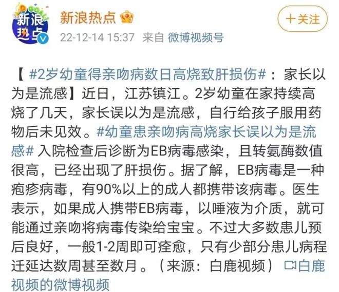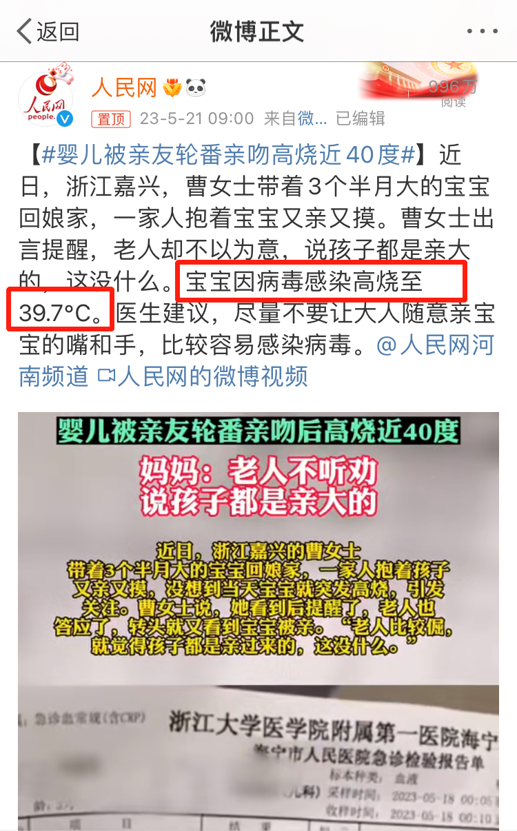 前几日,便有新闻报道3个月的婴儿被一家人又亲又摸,导致发烧近40℃被送进医院。孩子妈妈阻止的时候,却遭到家中老人怒斥:“孩子都是亲大的,这有什么啊!”很多时候我们在科学育儿和老人的传统观念中博弈都会落于下风。大家都知道老人喜欢孩子,这本身并不是错的。但要是表达爱意的方式错了,就极有可能给孩子造成健康危机。所以,今天这篇文章一定要转发到家族群里,告诉大家爱孩子的话就更要遵循科学的养育方法。什么是“亲吻病”?亲吻病,也叫传染性单核细胞增多症是由EB病毒所致的急性自限性传染病,像父母亲吻儿童、口对口喂食等都会发生感染。传播途径主要由飞沫与唾液经呼吸道传播,由于口腔分泌物传播,口-口传播是它重要传播方式。EB病毒平时大量存在于唾液腺及唾液中,可持续或间断排毒达数周,数月甚至数年之久。家长亲吻宝宝,口对口喂养,EB病毒就会通过唾液传给孩子,导致生病。有数据显示95%的成人都携带EB病毒,一般来说不会发病,但如果是抵抗力低下的宝宝感染,就不一定安然无恙了。亲吻病并非偶发事件,过往已有很多相关案例报道。但是,家长们对于这种疾病的了解,还是知之甚少。目前EB病毒感染并没有治疗的特效药,也没有预防的疫苗,只能对症治疗,等待自愈,这个过程很漫长,差不多需要2~4周。很多时候被感染的人并没有不舒服的感觉。如果感染了幽门螺杆菌,但没有症状的家长,嚼碎了食物喂孩子,或者和孩子共用餐具、亲吻孩子,这些举动就有可能会把幽门螺杆菌传染给孩子。2012年,世界卫生组织国际癌症机构将幽门螺杆菌列为一类致癌物,胃癌的产生,也和它脱不了干系。大部分的孩子感染后不会致病,没有任何表现,比较轻的感染会表现出腹胀、腹痛、打嗝、反酸、恶心、呕吐、食欲不振等常见的消化道症状。比较严重的感染则会出现消化道溃疡,甚至是消化道出血。轮状病毒可以通过口-口途径传播,如果家长感染了轮状病毒,又亲吻了宝宝,那么病毒会随之传染给孩子。轮状病毒具有高度传染性,3岁以下的儿童极容易感染,一旦感染会出现呕吐、腹泻、高烧等症状。轮状病毒感染一般常见的症状为腹泻,有时一天宝宝会腹泻10-20次之多,大便呈蛋花汤样,同时伴有发热、恶心、呕吐、嗜睡等症状,病程为7-10天。腹泻很容易造成脱水、电解质紊乱、肠套叠等情况,严重时甚至会危及宝宝生命。所以治疗的关键是及时、足量口服补液盐,有紧急状况马上就诊。一位来自美国爱荷华州的妈妈,就在社交网络上向人们讲述了18天大的女儿Mariana,因为被家人亲吻后,染上单纯疱疹病毒,最后恶化成脑炎,不幸离世的悲伤故事。Mariana出生不到6天,就开始不吃不喝,陷入了昏迷。病情发展迅速,她很快不能自主呼吸,器官也开始衰竭。经过一系列检查后,Mariana被确诊染上了口唇疱疹病毒,并且恶化成了病毒性脑炎。住院之后的48小时之内,医生给Mariana进行了6次输血,几乎把她身上所有的血液都换了一遍。但这个刚出生18天的小天使,最终还是离开了人世......