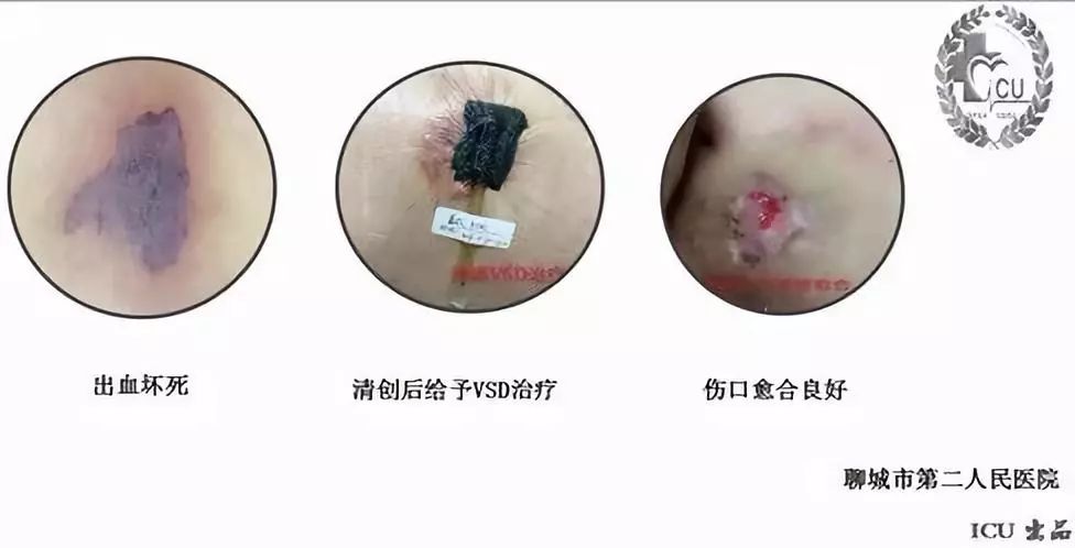 张某,男,50岁,于2018.104,16:32因“脑出血后遗症期、气管切开术后、肺炎、呼吸衰竭”入ICU,入室后给予呼吸机辅助呼吸。为防止患者深静脉血栓的形成,遵医嘱给予低分子肝素钠皮下注射。2018.10.4,在给患者皮下注射低分子肝素钠后,出现皮下出血,面积8×5 cm2,立即予冰块冷敷,效果不佳,出血处皮肤颜色加深。10.7给予局部TDP照射tid,效果不佳,一周后表皮坏死,主任给予去除坏死组织后给予VSD治疗。使用VSD治疗半个月后,患者伤口愈合良好,未见明显感染迹象。
