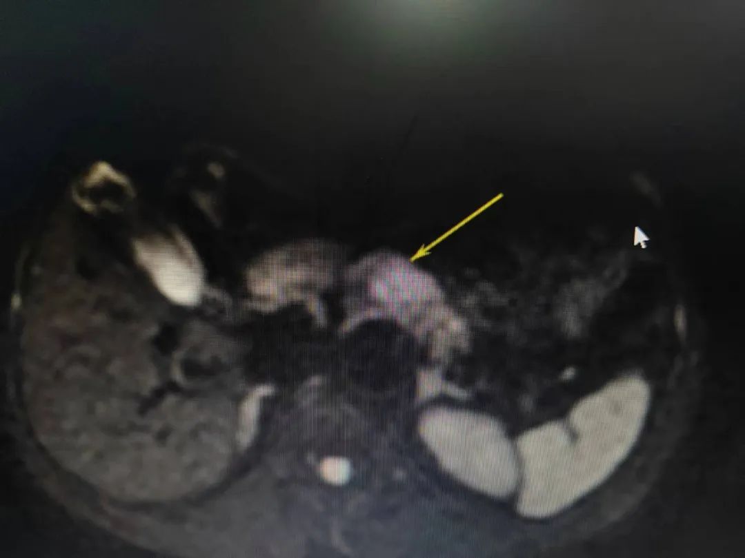 男,49岁,农民,腹胀,反复发作胰腺炎入院,MR检查示胰颈部低密度影(癌?)伴远侧胰管扩张,行胰颈部癌中段切除术,胰肠吻合术。