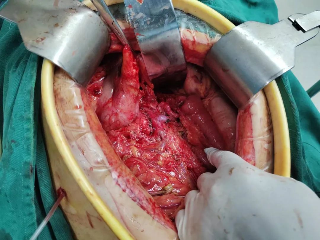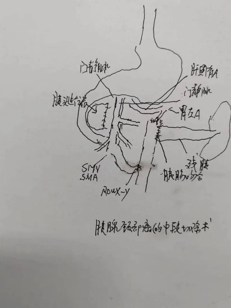 手术难处:反复发作胰腺炎致腹膜后粘连,仔细在胰腺背侧分离出肠系膜上静脉,脾动静脉,门静脉,肝固有,腹腔干胃左血管,并清扫腹膜后组织,切除中段胰腺,距肿瘤左右侧各2㎝余,快速冰冻两侧切缘均阴性(R0),残留胰体尾行胰肠吻合术,和肠肠Roux一Y吻合!