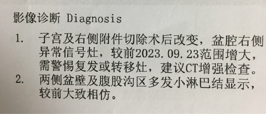 1.患者卵巢肿瘤术后,历经化疗、靶向治疗出现复发,经评估没有出现转移,这种情况下要尽可能把握手术机会,帮患者进行肿瘤的清除。